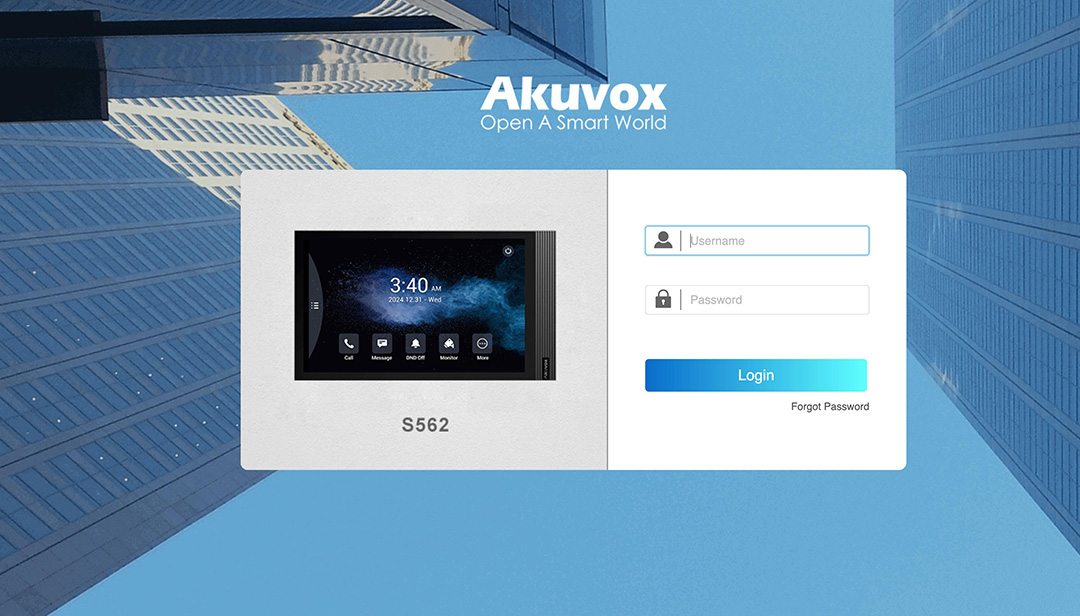 Surfa till porttelefonens IP-adress, användaruppgifterna är user: admin, password: admin, efter att du loggat in så måste du byta till ett nytt lösenord.