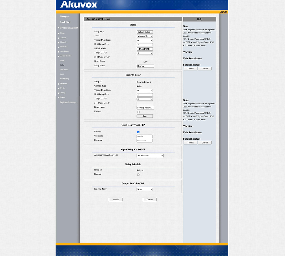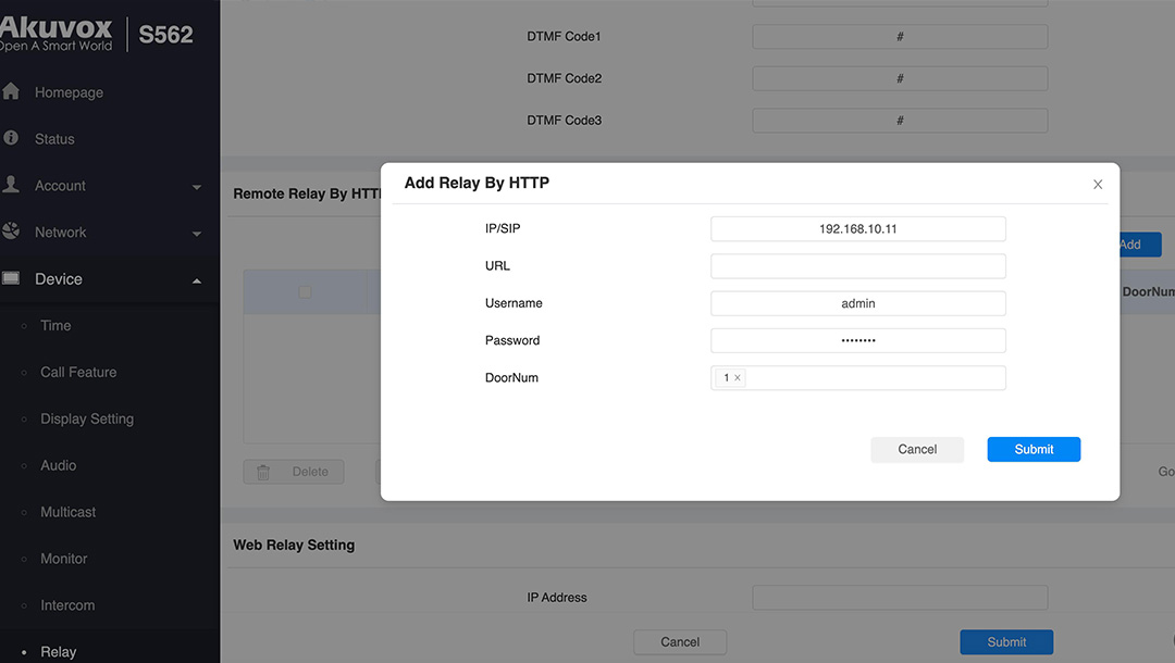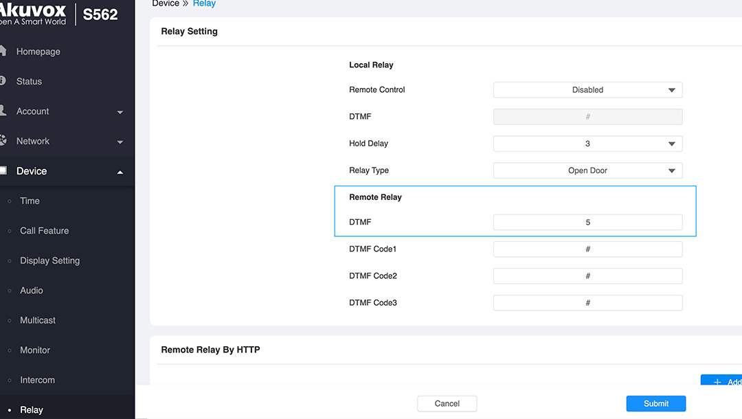 Gå till Device -> Relay, här hittar du Remote Relay och DTMF, här skriver du in samma värde som du satte i porttelefonen, i exemplet satte vi 5.