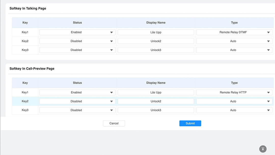 Under Softkey in Talking Page väljer du "Remote Relay DTMF" då kommer svarspanelen låsa upp dörren med DTMF 5 som du ställde in i tidigare. Under Display Name skriver du in vad som ska stå på knappen till exempel "Lås Upp", det kommer då att stå Lås Upp på knappen du trycker på för att öppna. Key 2-3 kan du sätta som "Disabled" annars kommer dessa synas på displayen.
