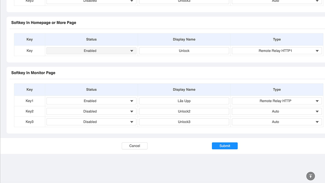 Under Softkey in Monitor Page väljer du också "Remote Relay HTTP", döp till "Lås Upp" och välj "Disable" på de andra knapparna.