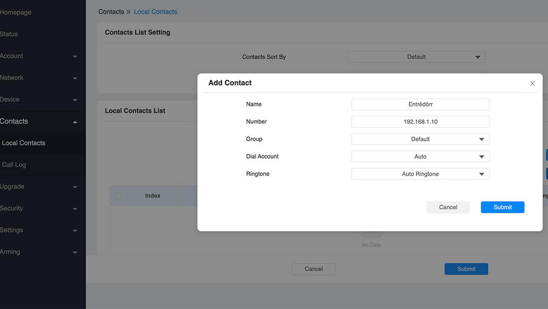 Under Contacts -> Local Contacts lägger du upp porttelefonen som en kontakt, klicka på + Add, Skriv in namn till exempel Entrédörr, IP-adress och klicka sedan på Submit för att spara.