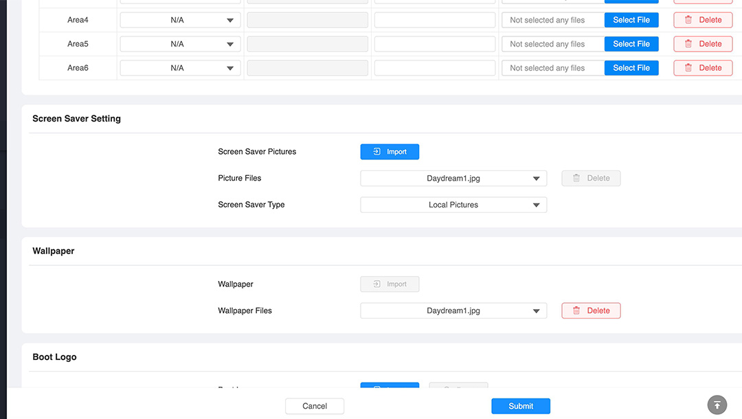 Om du vill så kan du ladda upp lite bilder som visas när svarspanelens skärmsläckare går igång. Du kan skapa bilderna i valfritt bildbehandlingsprogram. De måste ha en upplösning på 1024x600, vara .jpeg format, och inte större än 256kb. Bildfilens namn måste bestå av bokstäver eller siffror. Klicka på "Import" för att ladda upp en bildfil. Efter att du har laddat upp en bild så kan du ta bort de förprogrammerade som heter "Daydream1.jpg" och "Daydream2.jpg".