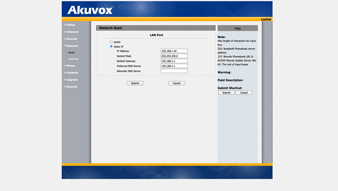 Gå till Network -> Basic, ställ in önskad statisk IP-adress till exempel 192.168.1.10, fyll även i Gateway och DNS och tryck på Submit för att spara.