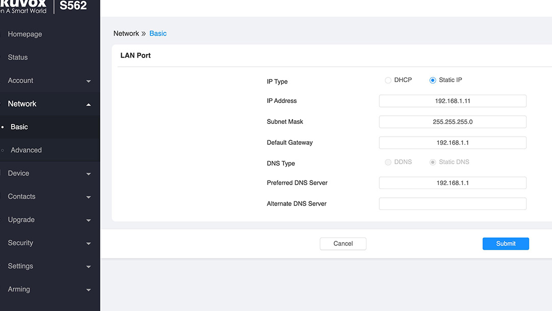 Gå till Network -> Basic och ändra till en valfri statisk IP-adress till exempel 192.168.1.11, skriv även in Gateway och DNS, klicka sedan på Submit för att spara.