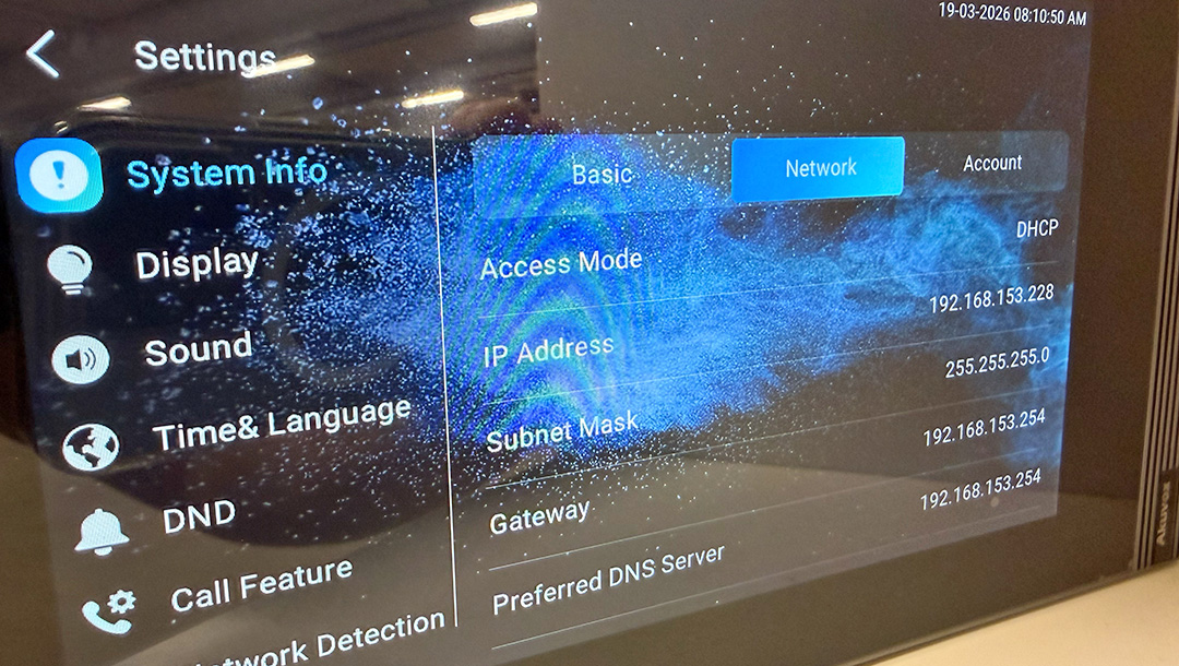 För att få fram IP-adressen till svarspanelen så trycker du på More -> Settings -> Network direkt på skärmen så får du fram vad enheten har fått för IP-adress.