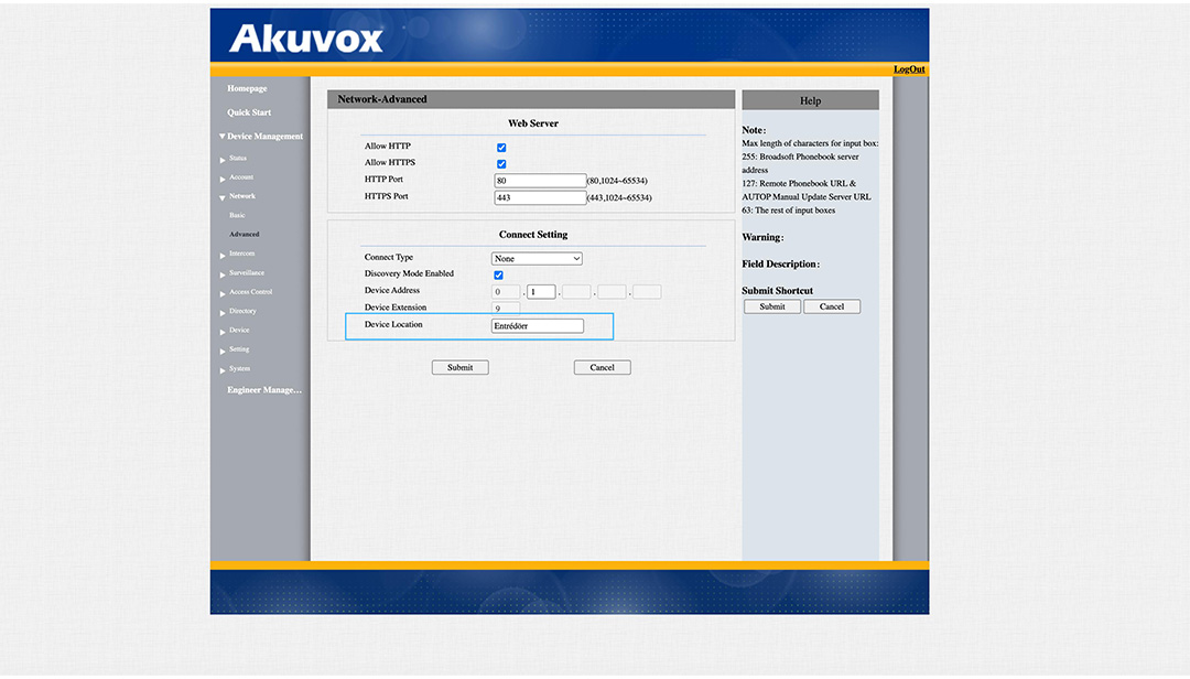 Klicka först på Device Management, för att ändra porttelefonens namn gå till Network -> Advanced, scrolla längst ner på sidan, här kan du döpa enheten, det är vad som kommer att visas på svarspanelen när någon ringer på.