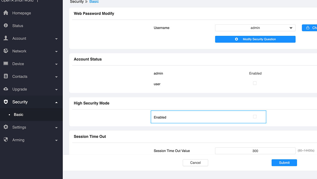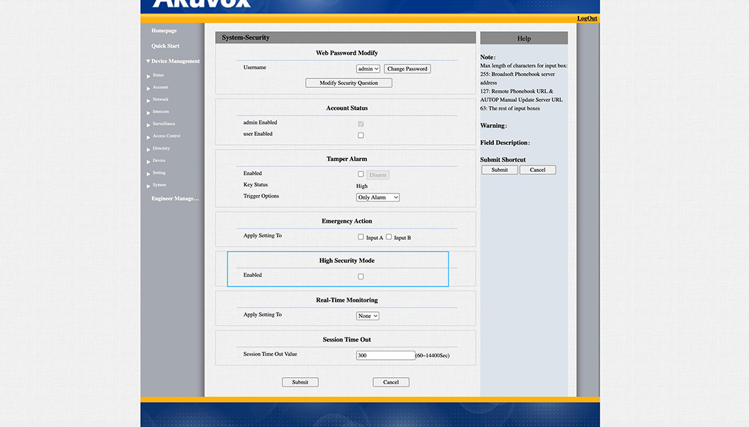 Gå till System -> security och se till att "High Security Mode" är urbockat. Om du ändå vill använda det, så se till att det är ibockat på både porttelefon och svarspanel, klicka på Submit för att spara.