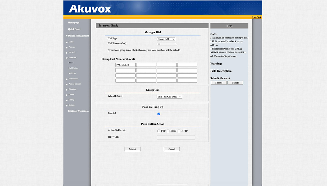 Gå till Intercom -> Basic, längst upp på sidan hittar du Call Type, här kan du välja mellan Sequence Call eller Group Call. Om du har fler paneler och vill att det ska ringa i en specifik ringföljd så väljer du denna, annars kan du välja Group Call så ringer det på alla samtidigt . I rutorna så fyller du i IP-adressen till svarspanelen/erna om du har flera, dessa kommer då att ringas upp samtidigt som någon ringer på porttelefonen.