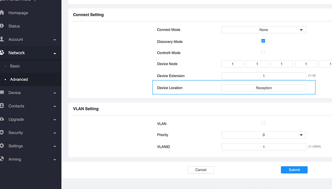 Gå till Network -> Advanced, scrolla längst ner på sidan, här kan du döpa svarspanelen till var den är placerad till exempel Reception (Om du har fler svarspaneler så kan du sedan ringa mellan panelerna som en bonus och använda det som ett intercom system)