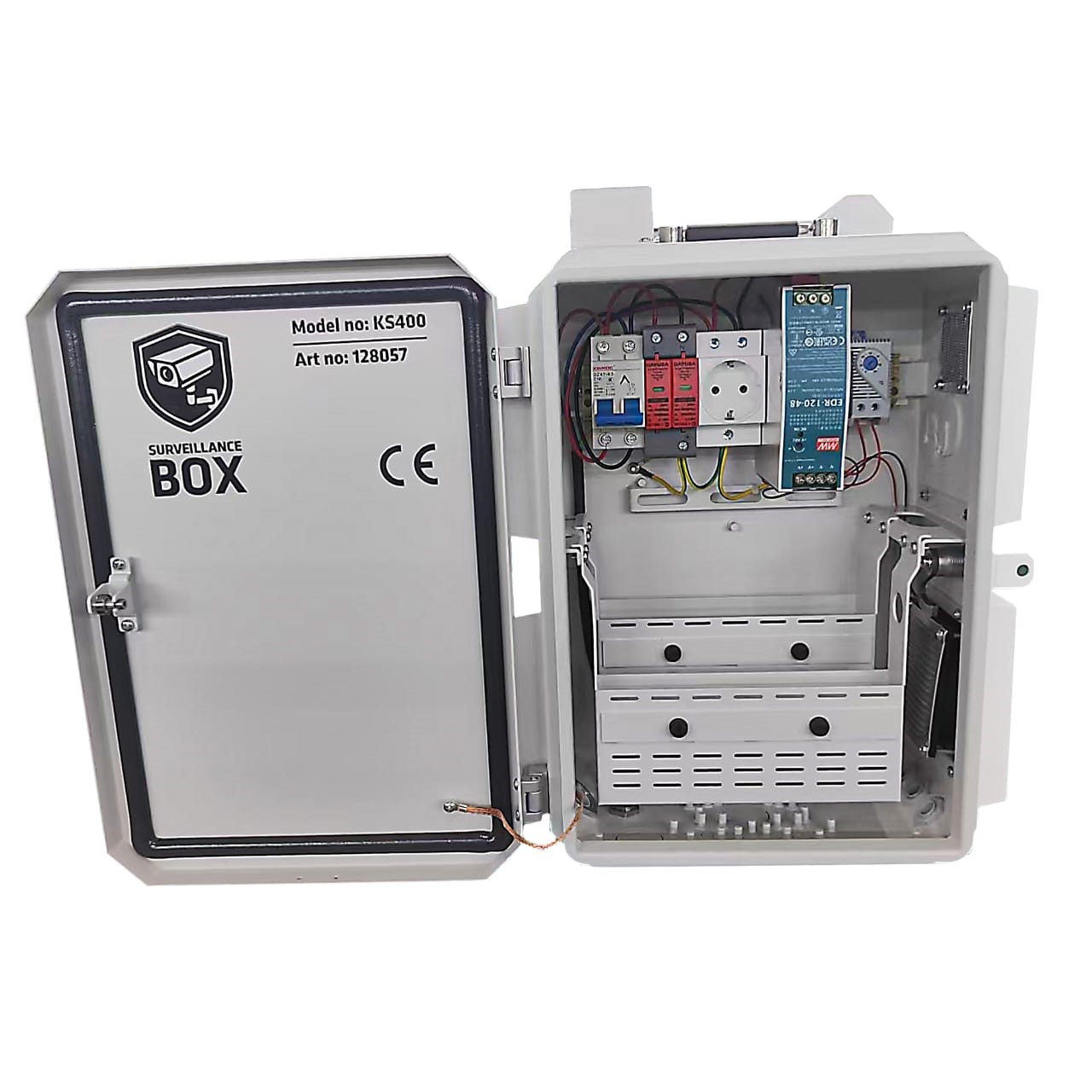 KS400 är ett skåp designat för övervaknings- och kamerainstallationer utomhus på stolpe eller vägg. Med termostatstyrd fläkt och plats för trådlös router, POE switch och övrig utrustning är KS400 det rätta valet för den perfekta kamerainstallationen. Det finns ett förberett kamerafäste på vardera sida av skåpet och ett kamerafäste på undersidan av skåpet. Det är även förberett för montering av IP-högtalare på ovansidan av skåpet. 2x Antennfästen för 4G/5G-router finns på ovansidan av skåpet.